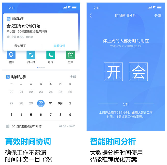 云之家產(chǎn)品總監(jiān)宋凱表示,“時間去哪了”一直是每個工作者的大焦慮。云之家V10推出“時間助手”應(yīng)用,可記錄管理個人日程并自動提醒;通過日程共享,可實(shí)現(xiàn)團(tuán)隊(duì)成員時間安排的透明化;通過主動“搶占”領(lǐng)導(dǎo)和同事的時間,可提升整體協(xié)作效率。