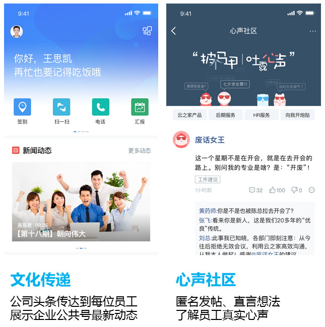 宋凱認(rèn)為,傳統(tǒng)的企業(yè)文化建設(shè)缺少互動,說教的方式讓年輕人難以接受。云之家同事圈通過線上互動社區(qū)把員工召集在一起,建立新生代的企業(yè)文化。