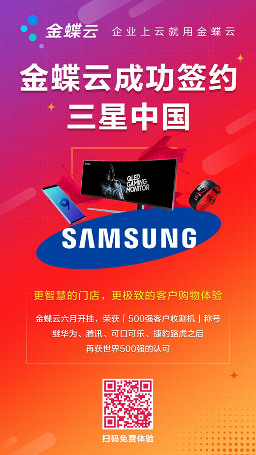 7.4日訊,恭賀金蝶云簽約三星中國。近日,三星中國正式上線金蝶云全渠道營銷系統(tǒng),金蝶云將幫助三星管理上千價零售門店,這也是繼華為、騰訊、OPPO、阿里、海爾之后,金蝶云簽約的又一世界級名企。