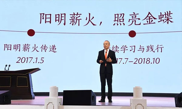 這種光明從何而來?2016年5月28日,我到了龍場,在這里開啟了我和金蝶兩年多的致良知學習和踐行。2016年5月28日,我到了陽明先生龍場悟道的地方玩易窩,在那里我跟陽明先生有了次親密接觸。然后在6月18、19日,我?guī)е鸬?2名高管莊嚴地立下了我們人生的志向,那就是一定要此生光明。2017年的1月5日,我們有幸作為家企業(yè),把陽明薪火從北京四合院傳遞到了深圳金蝶的總部。這個薪火也是從陽明先生龍場悟道的玩易窩,鑿石取火取到的,是真正的光明之火。