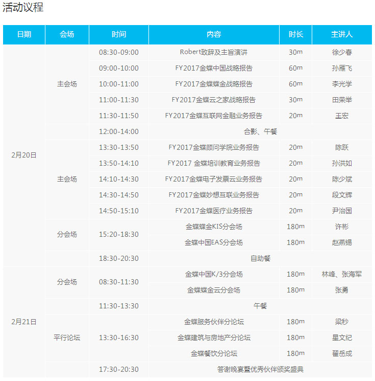 金蝶中國與金蝶蝶金2017年重點戰(zhàn)略規(guī)劃;金蝶產(chǎn)品與渠道業(yè)務規(guī)劃、優(yōu)秀渠道合作伙伴經(jīng)營與管理經(jīng)驗分享。